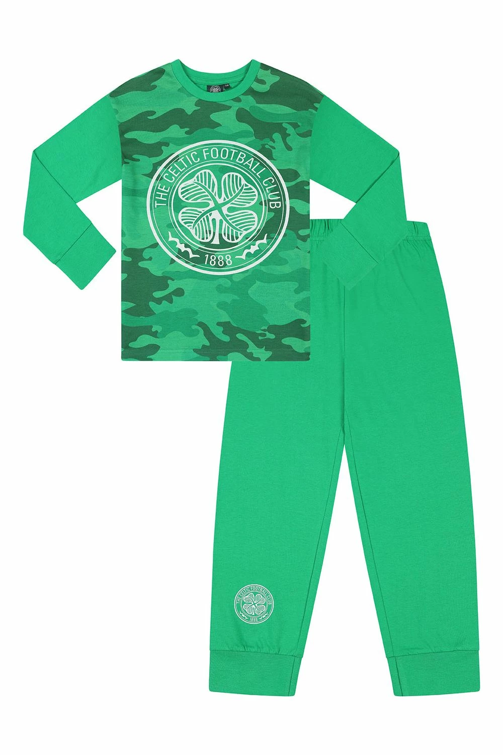 Celtic Football Club Boys Long Pyjamas. These come with a long sleeve pyjama top with a camouflage print, Celtic crest on the chest and pants with an elasticated waist. These cool pyjamas would make fantastic gift for any Celtic fan.