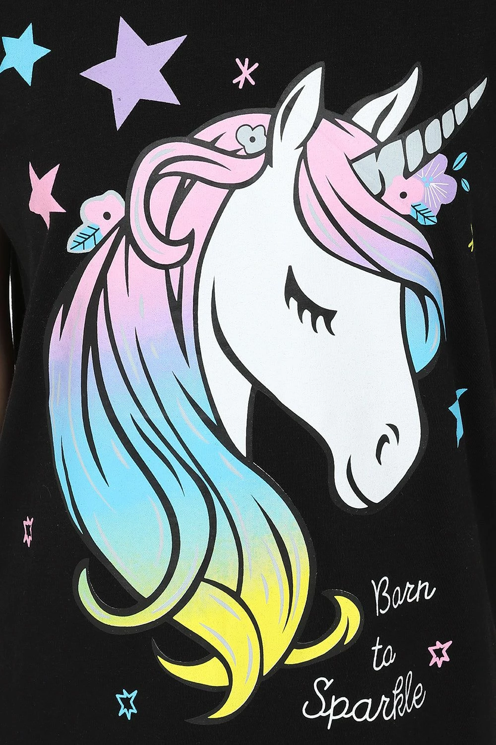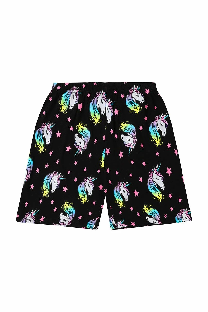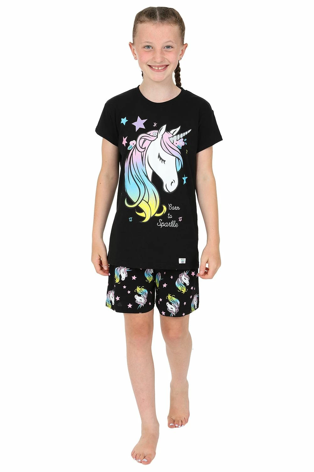 Girls pyjama short set with Super Cute Unicorn ‘Born To Sparkle’ slogan printed across the front .This set is complete with matching elasticated Short bottoms . These will be a firm favourite in pyjama drawers and is perfect for Warmer nights.