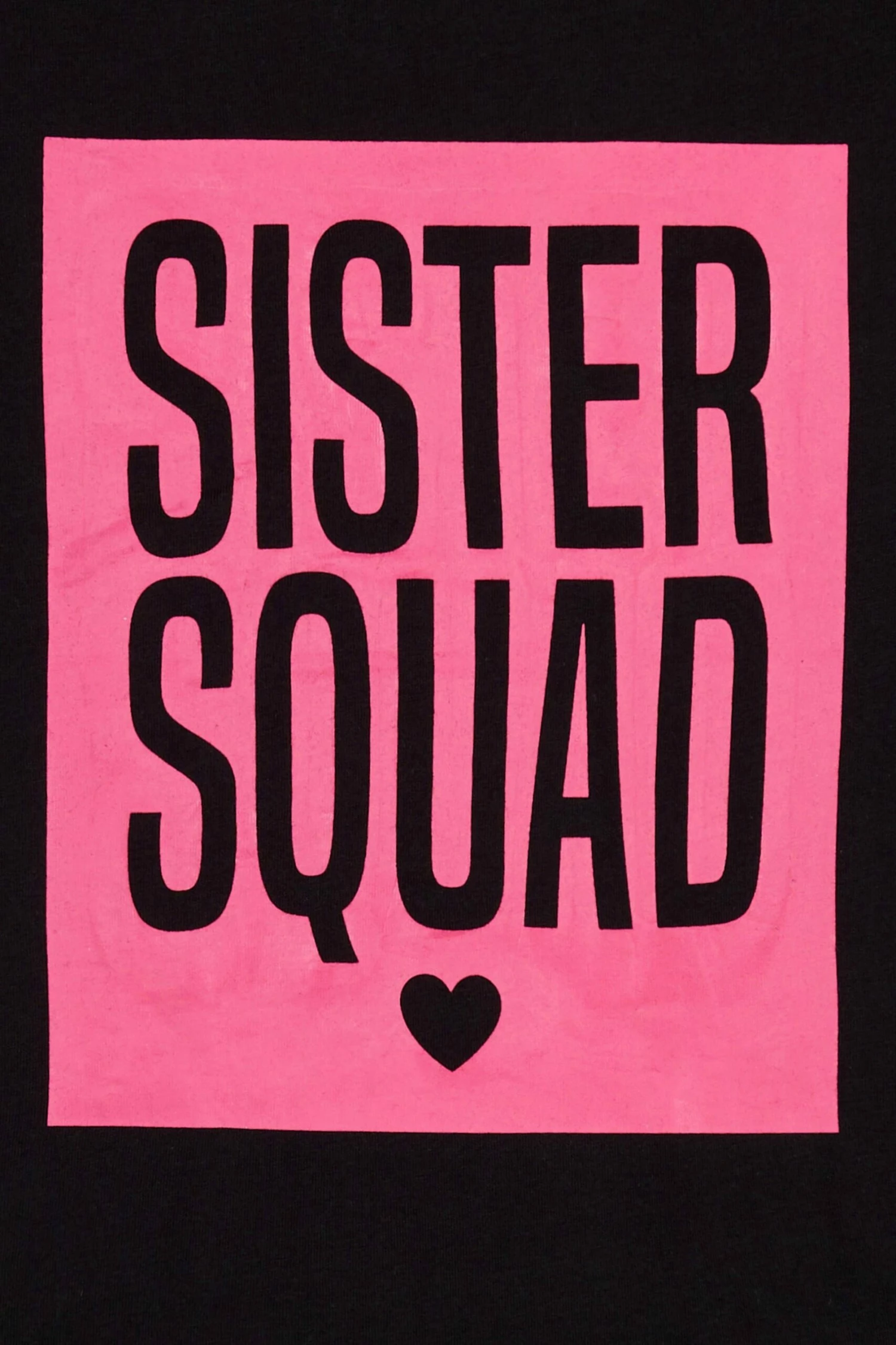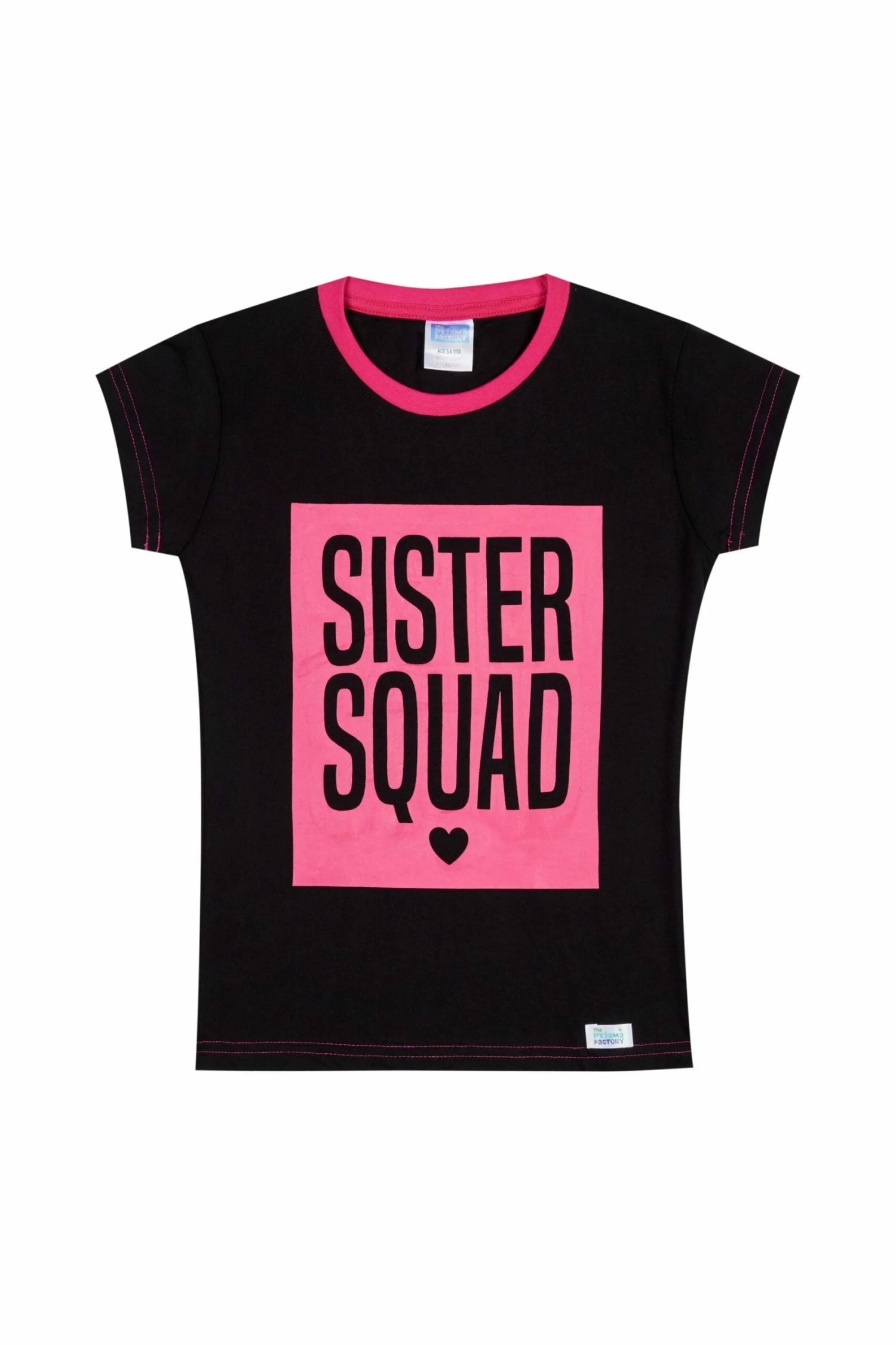 Girls pyjama set with ‘Sister Squad’ slogan printed across the front .This set is complete with matching elasticated bottoms . These will be a firm favourite in pyjama drawers.