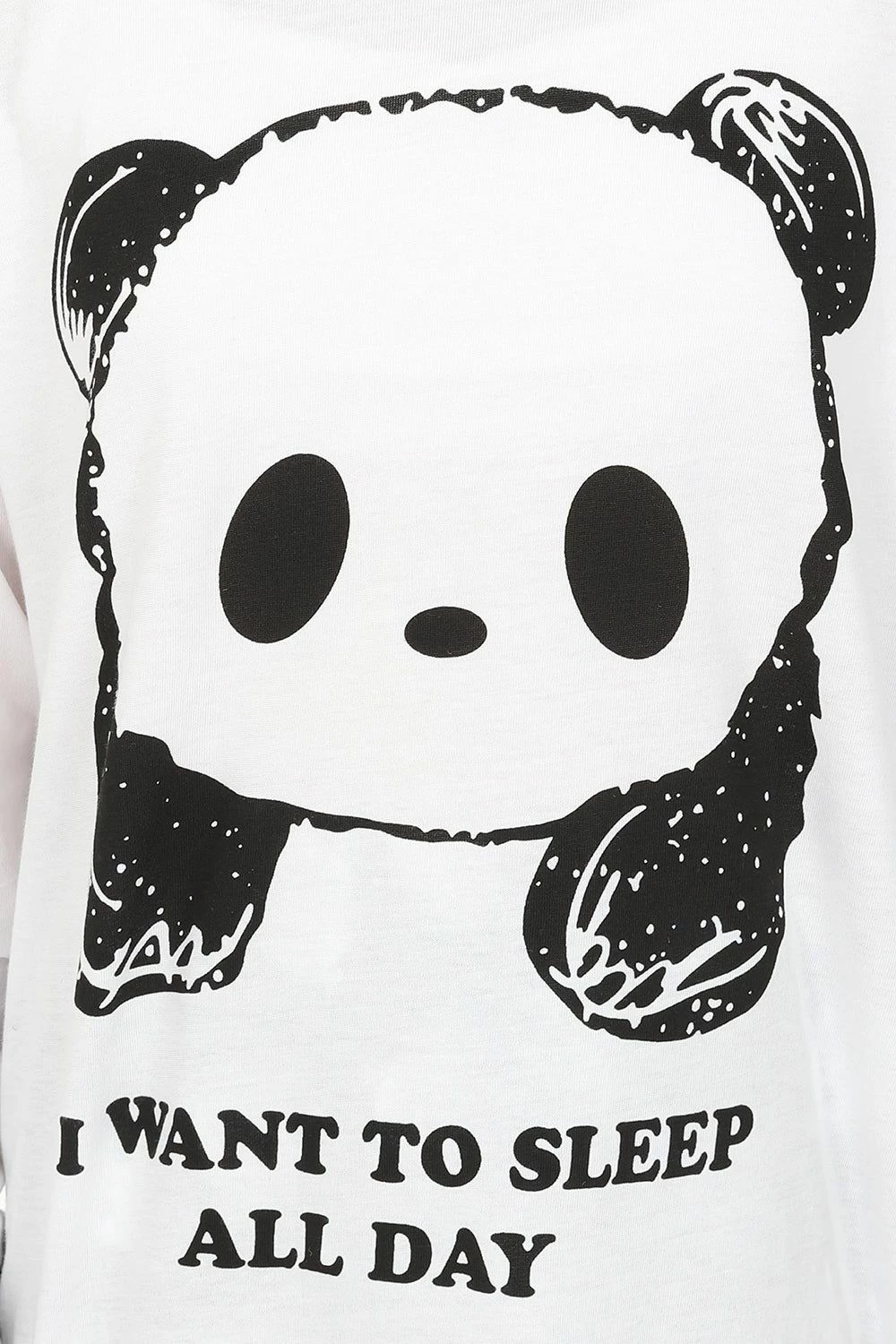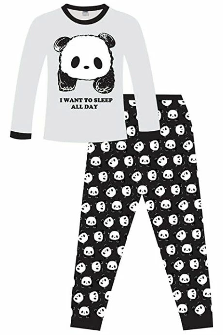 Cheeky girls pyjama set with a “I want to sleep all day” slogan printed across the front with an adorable Panda. This paw-some set is complete with matching elasticated Long bottoms and is sure to be a firm favourite in her pyjama drawer.
