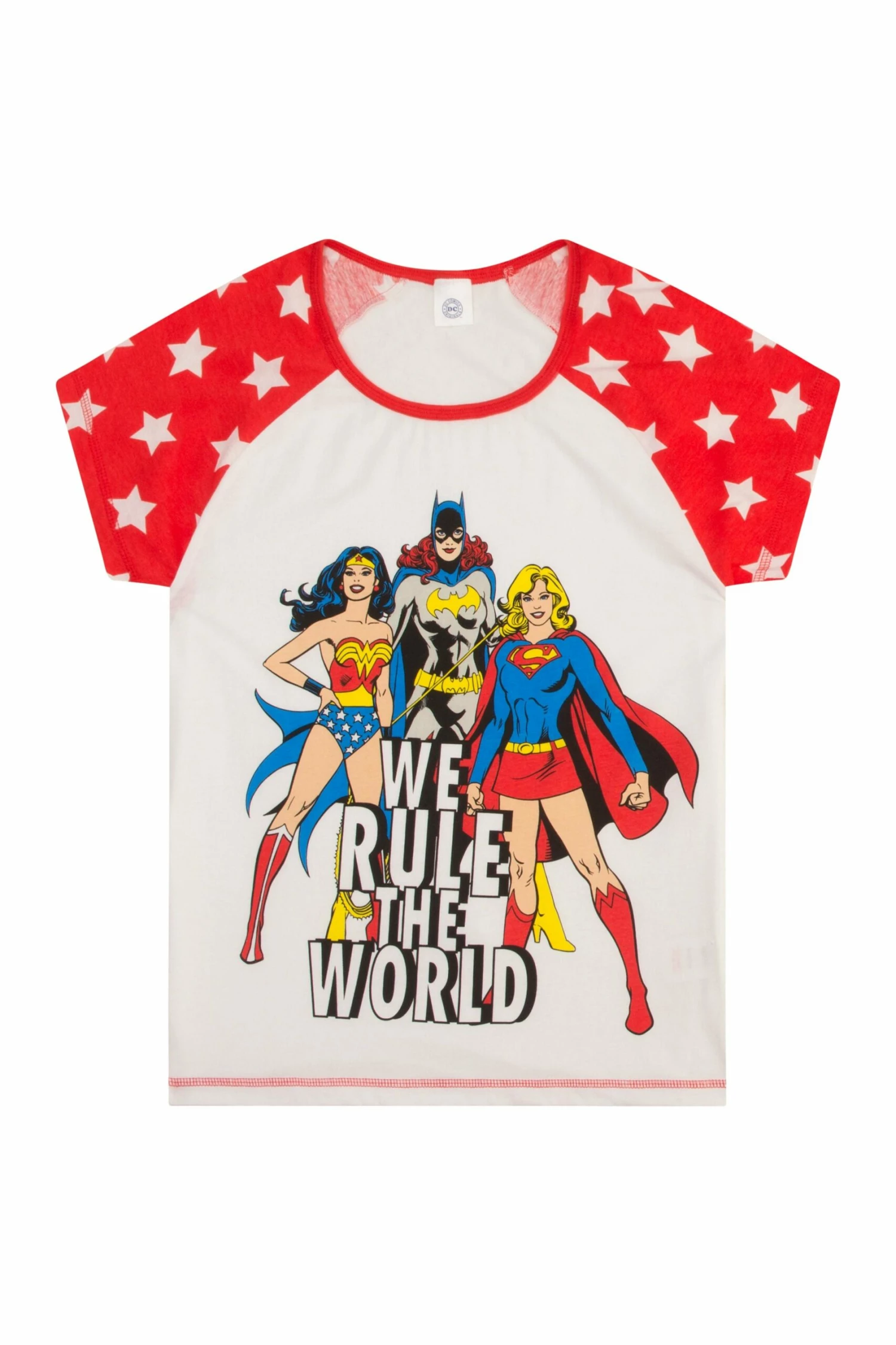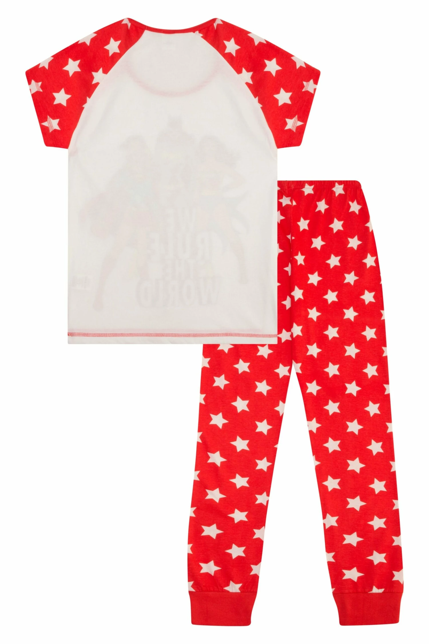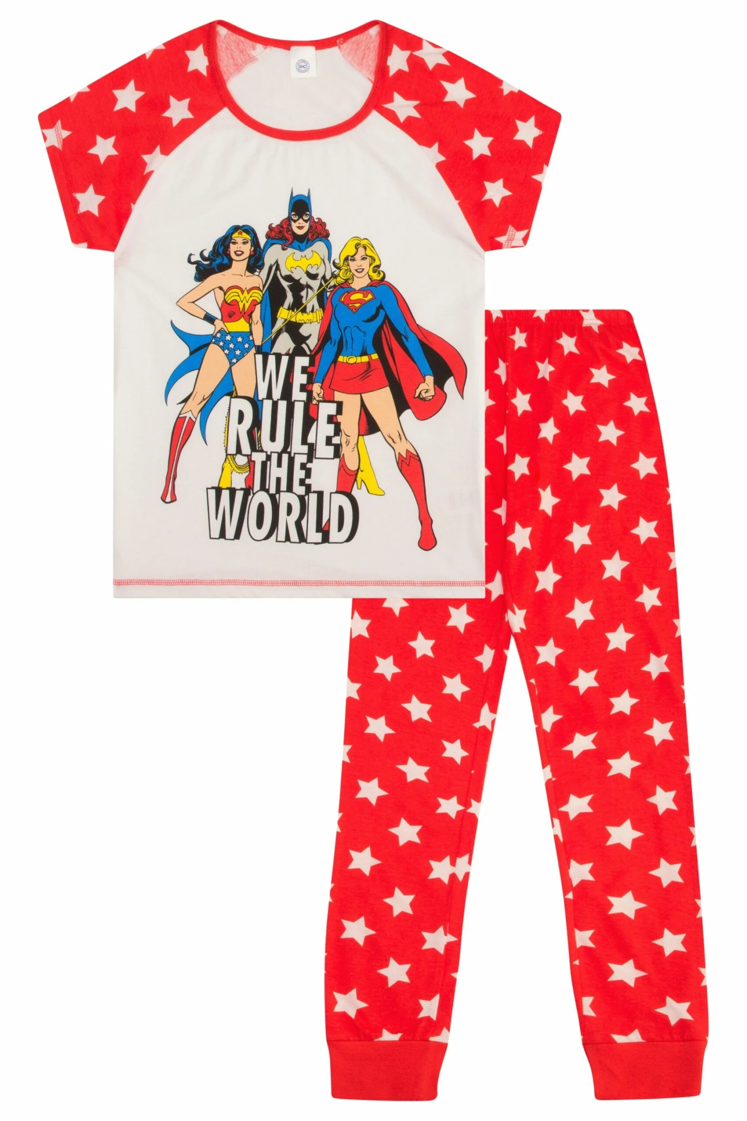 includes a short sleeved top featuring Wonder Women – Superwoman and Batwoman with matching print bottoms.