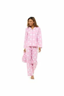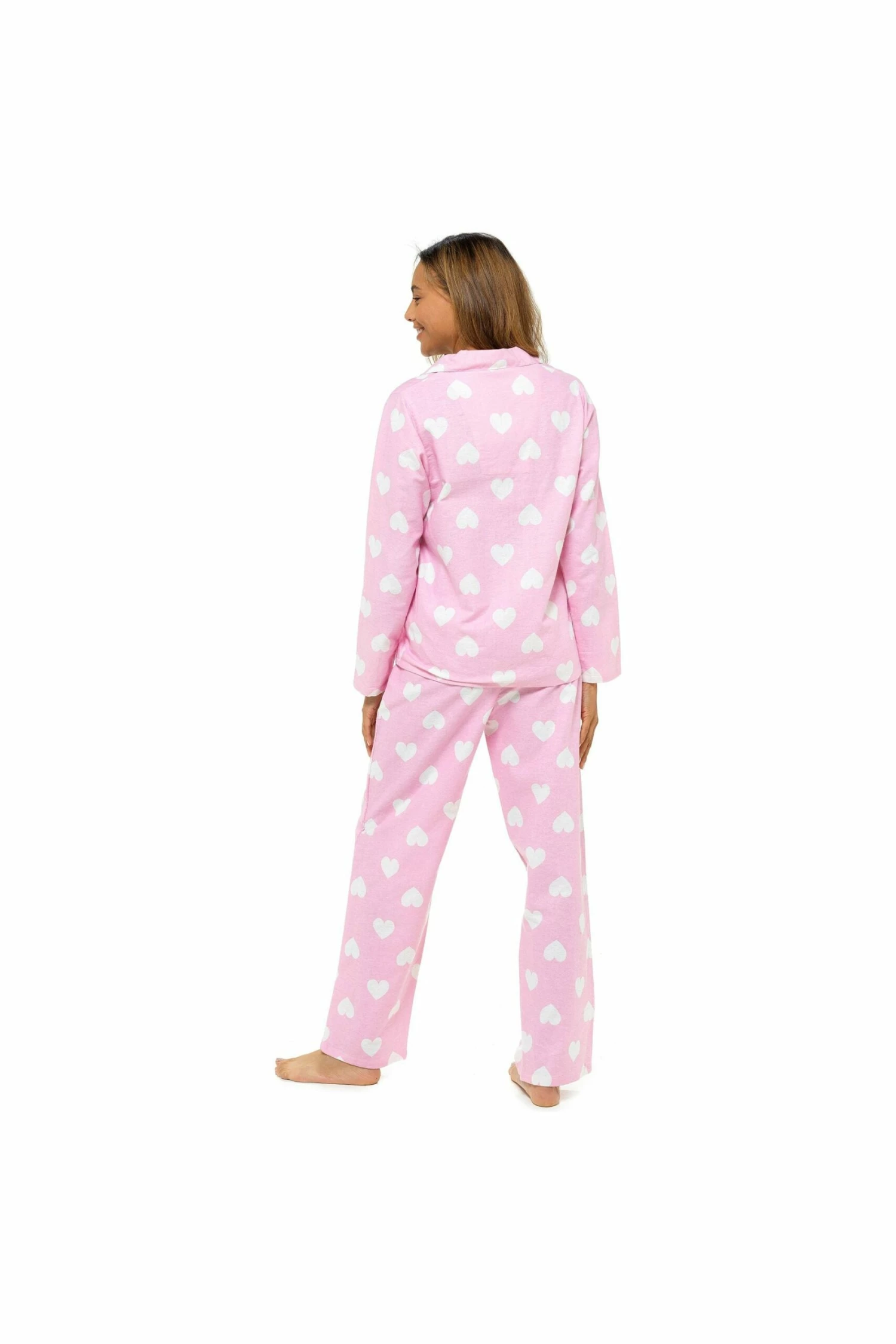 Women’s Pink Heart Print Buttoned Long Pyjama Set With PJ Bag